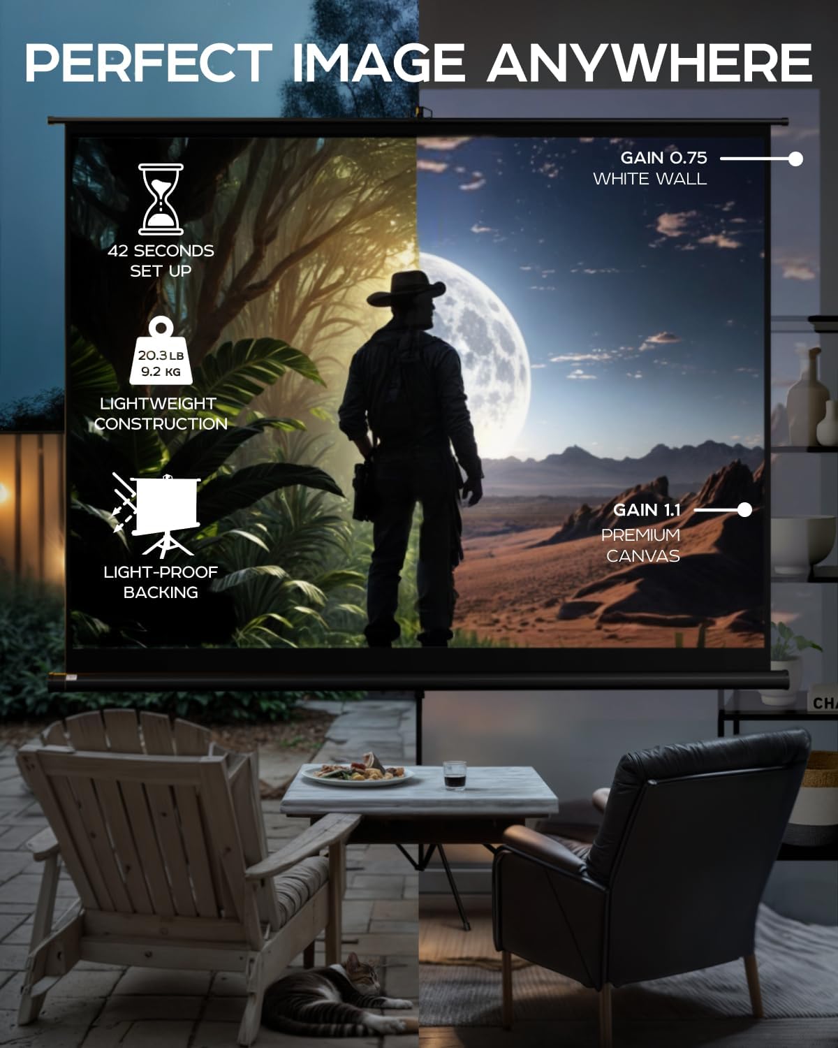 This 120-inch portable projector screen with stand turns any wall, backyard or open space into a cinema quickly. The foldable screen and tripod stand make setup simple — no hassle, no heavy equipment.